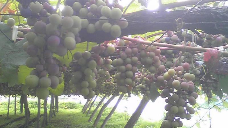 赤肉と呼ばれるぶどう品種『ベリー・アリカントA』の現在の画像です(高畠町の契約農家の畑)。