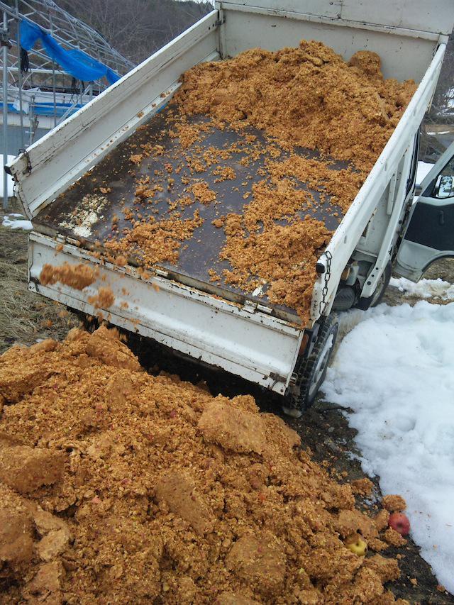 4月にもなったので、冬仕事でやってだリンゴジュースの委託加工も終わりの方になってきました。昨日は大口の注文を瓶詰め。一応今月いっぱいで受付を終了する予定です。画像はリンゴの搾りかす。