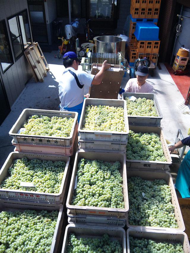 プレス機から流れ出てくる果汁も、生ぶどう同様にかんなしフルーティー。ナイアガラの果汁はあんまり搾んねくても澱がけっこう多いので、一晩澱下げして明日上澄み部分に酒母を添加し発酵させます。今日の仕込み分は今年、国産ワインコンクールで銅賞受賞した『うすにごりナイアガラ』になります。