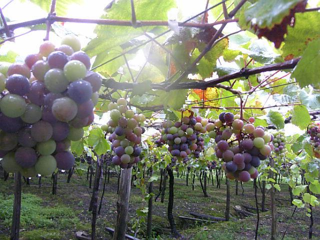 今現在、「飛び玉」と呼んでますが、緑の部分と黒い部分がカラフルに彩り、かなりきれいです。一ヵ月後には真っ黒に熟して、赤ワインに変身します。台風にも負けず、あと一ヶ月順調に育って欲しいです。