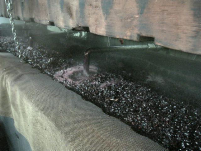 「船」と呼んでる、おっきな搾り機の中さ潰した赤系のブドウば入れでってよぉ、それば一晩煮ます。画像は分かりにくいげんと、船でブドウを煮てるところ。