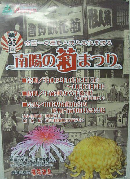 今年で95回を数える「南陽の菊まつり」。かなり歴史の有るまつりです。今年も、10月12日(金)からオープンしました。秋の観光に、是非南陽市宮内さござっとごえ。11月11日(日)までやってます。時間はAM9〜PM5まで。今年の菊人形のテーマは「風林火山」。