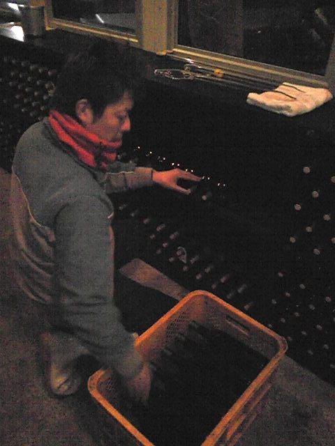 外は寒い日でしたが、ワインセラーの中は若干暖かいです。今日は、セラーの中の樽に目減りしたワインを補充したり、空いた棚に熟成させるワインを並べたりの作業。うちのセラーの棚には常時約3,000本のワインが熟成してます。ワインは直射日光も嫌うので、暗くしてあります。