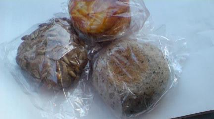 オレンジマフィン、切り干し大根のおやき風のパン、ひまわりの種とくるみとごまのパンを買いました。