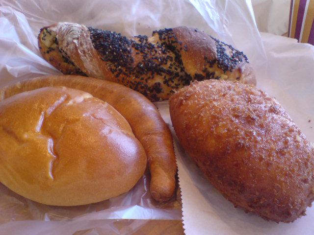 まずは、いつものクリームパン、カレードーナツ、あと、三日月のように細いパン、オレンジ金時パン購入。