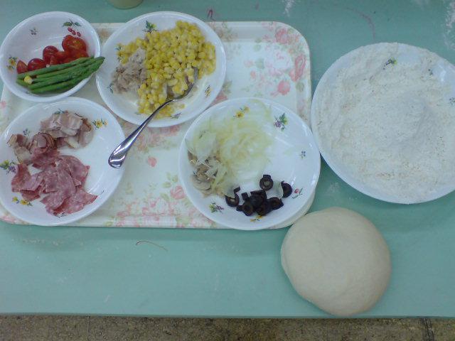 ピザ生地は前日焼いておいたので、みんなには、トッピングを選んでもらう。パン生地は粉の配合を変え、柔らかめに!