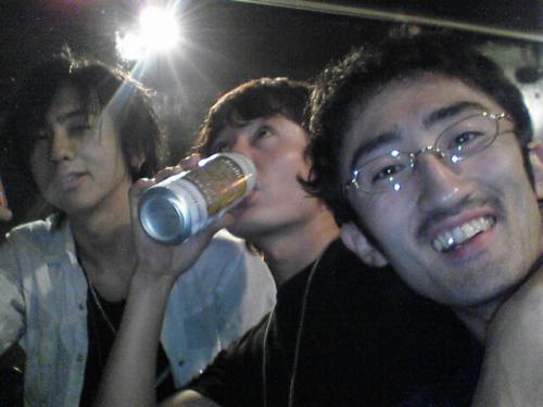 Pro.アーチストファイル〜バンド編〜はい、画像は我が飲んだくれ一族です(笑)左がリーダー&Gtの檀原さん。バンドの曲は全部この人作曲によるもの。ネタ王でさらに超絶ドリシア好き。んで、真ん中、DrのTOMYさん。よく注意をされます↓様々なリズムに対応し、かつやんちゃな人。やけに飲むイメージがある(笑)ラスト右、Keyのウォーリーさん。曲中で鍵盤を弾く手元を見ていると、ゲーセンで見かけるビーマニオタも真っ青のプレイ。あそこまでいくと軽いショー...とりあえず皆真面目でいい人たちです。滅茶苦茶お世話になりまくりで頭が上がりません。写真はライブ前のはずなんだけど...(笑)