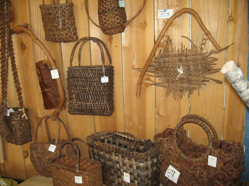 作家 菅 常子がみずから山に入り、籐・あけび・山ブドウ皮・くるみの皮・芭蕉・つづら藤などを素材にして、バッグ等を編み上げます。