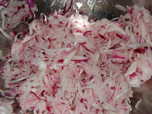 絞ったカブに甘酢をたらしながら混ぜ合わせます。