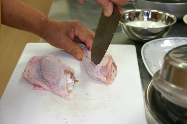 火の通りをよくするために、骨に沿って包丁で切れ込みを入れる。