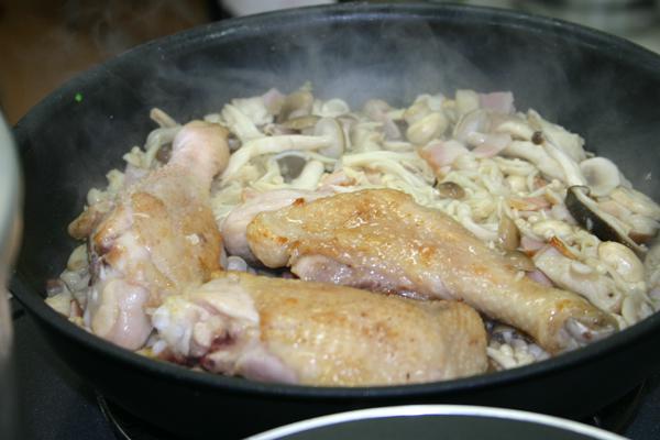 炒めたきのこの上に、さっき取り出した肉を今度は皮目を上にして並べる。