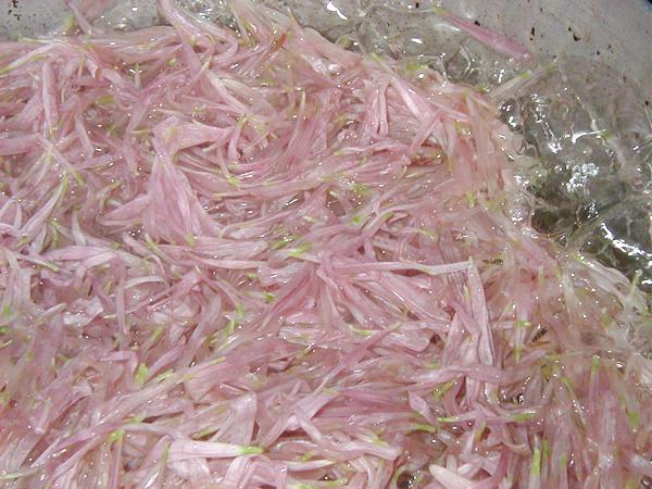 ・菊の花びらを一気に入れて、沸騰したら上下返すような気持ちで