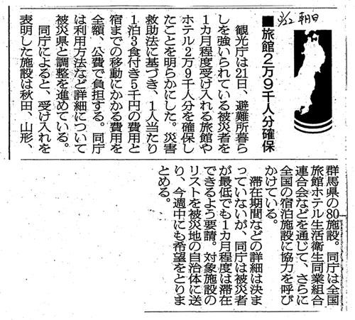 観光庁は21日、避難所暮らしを強いられている被災者を1ヶ月程度受け入れる旅館やホテル2万9千人分確保したことを明らかにした。---朝日新聞