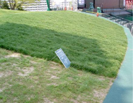 黒板の右側は緑化基盤マットに張芝をしオーバーシードした状態(刈込前)