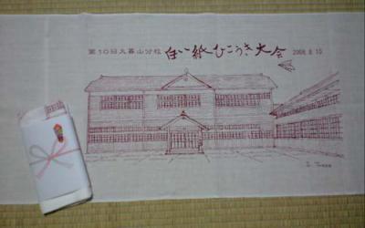 大会の余剰金で作った手ぬぐいを、大暮山地区の皆さんに、長年お世話になったお礼として配りました。デザインは、大会スタッフで建築設計士の田苗重樹さんの分校舍のスケッチです。とても優しいタッチで、想像以上に素晴らしい手ぬぐいができあがりました。スタッフ一同大満足でした。(2008.9.13)