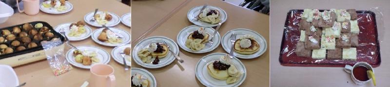 ホットプレートでホットケーキを焼き、餡やクリーム、フルーツなどで自分の好きなトッピングをしたもの(写真中央)、たこ焼き器を使って、丸いボール状にしたもの(写真左)、牛乳パックを使って電子レンジで蒸しパンを作り、ピラミット型に重ねたもの(写真右)など、各フロア様々なアレンジでおやつ作りを楽しみました。