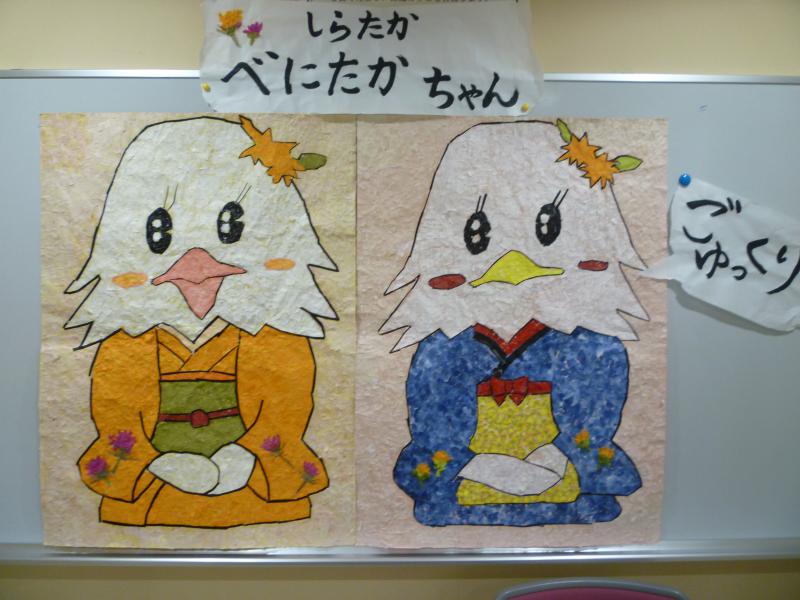 白鷹のマスコットキャラクターである「べにたかちゃん」というテーマで、紅花を入れてすいた和紙や皆様で手分けして色付けした紙を使用して、貼り絵を作りました。