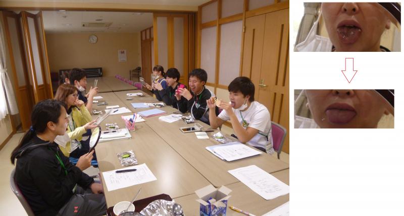 写真は黒いクッキーを食べて口内が汚れた後、きゅうりを食べるときれいになるという実験です。鏡で舌を確認してみるとよくわかります。
