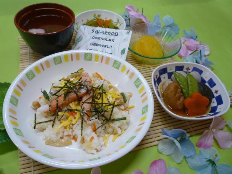 見た目も鮮やかで山菜の風味も感じられる山菜ちらし寿司は入所者の皆さんに、