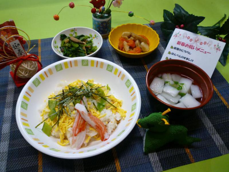 本日は、新春かにちらしと里芋の煮物、小松菜の和え物、はんぺんのすまし汁を