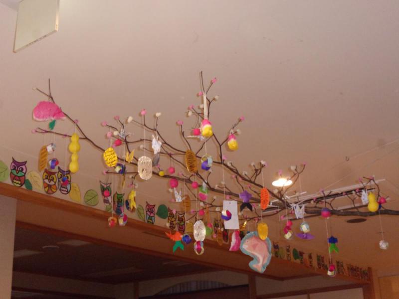 毎年恒例となった団子木飾り。今年も団子の木を頂いたので皆さんと一緒に飾りつけをしました。