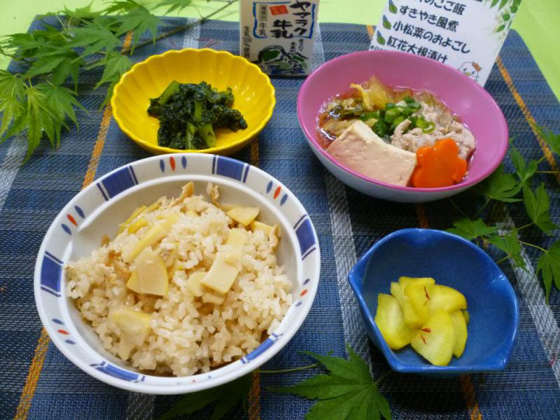 たけのこご飯のたけのこや油揚げ、すき焼き風煮の豚肉、ねぎ、糸こんにゃく、豆腐、小松菜、紅花大根漬け、牛乳は白鷹産のものを使用しました。
