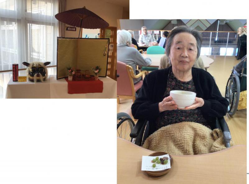 お正月らしく獅子頭などが飾られた広場でお抹茶と菓子を召し上がり、穏やかなお正月を迎えられておりました。