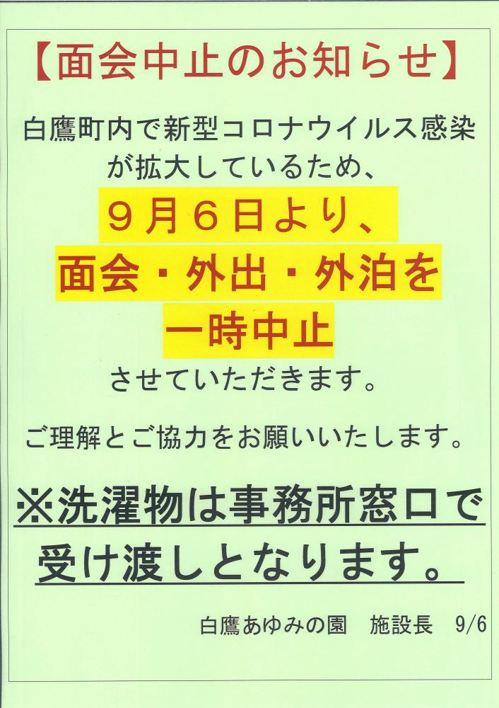 町内で感染症が広がっているため、令和7年9月6日より面会・外出・外泊を中止させていただきます。