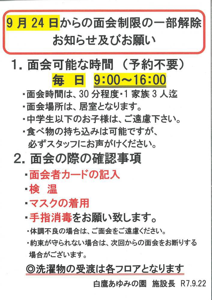 9月24日(水)より、面会制限を一部解除いたします。