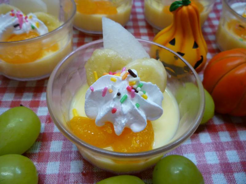 10月のお菓子の日は、プリンにバナナや生クリームをトッピングして
