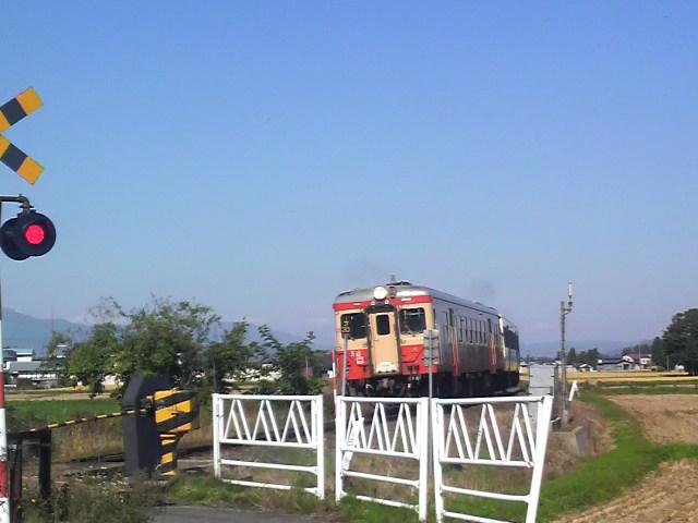 ◎ 地元を走る米坂線。米沢と新潟県の坂町を結ぶローカル列車です。国鉄カラーみたい。秋の景色に溶け込んで綺麗でした。