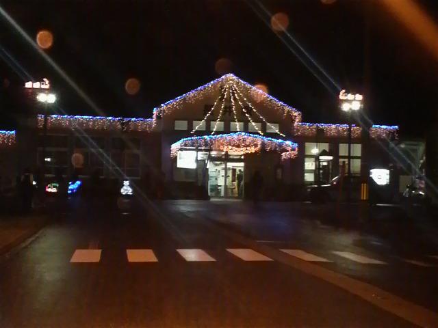 暗くなってきたから駅舎に行ったら、未だ点いてなくて、買い物帰りに寄ったら綺麗に点灯してました。