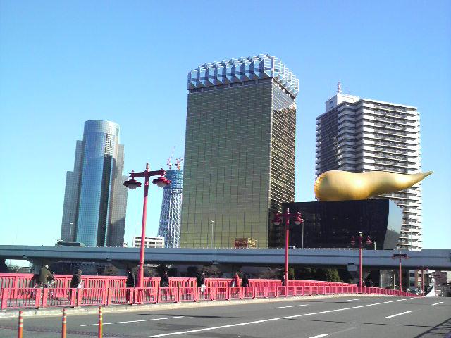 その本社ビルと墨田区役所の間に東京スカイツリーが見えてます。(街灯の右側)