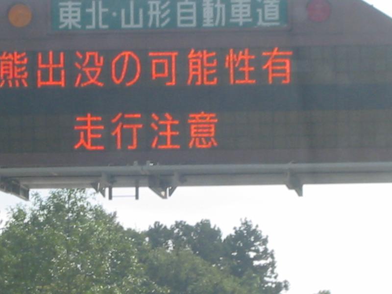 東北自動車道路を走行していましたら、電光掲示板に「熊出没の可能性あり。走行注意」な警告がのっており、大変びっくりしてしまいした。