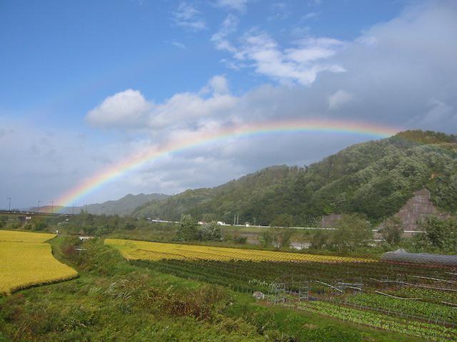 さて、風の谷間にふと空を見上げたらキレイな虹がでているではありませんか。
