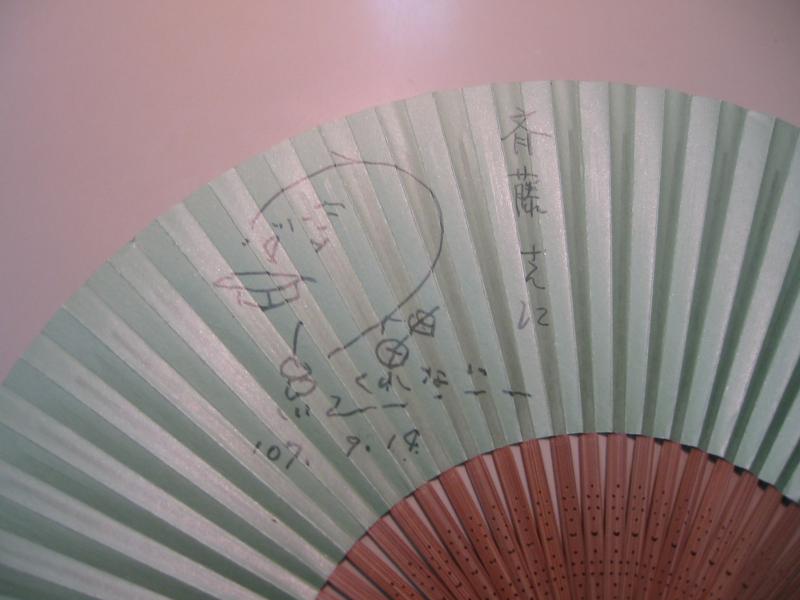 おずおずと、「お名前いただけませんか?」とサインペンと扇子を差し出したら、気持ちよくサインをして下さいました。