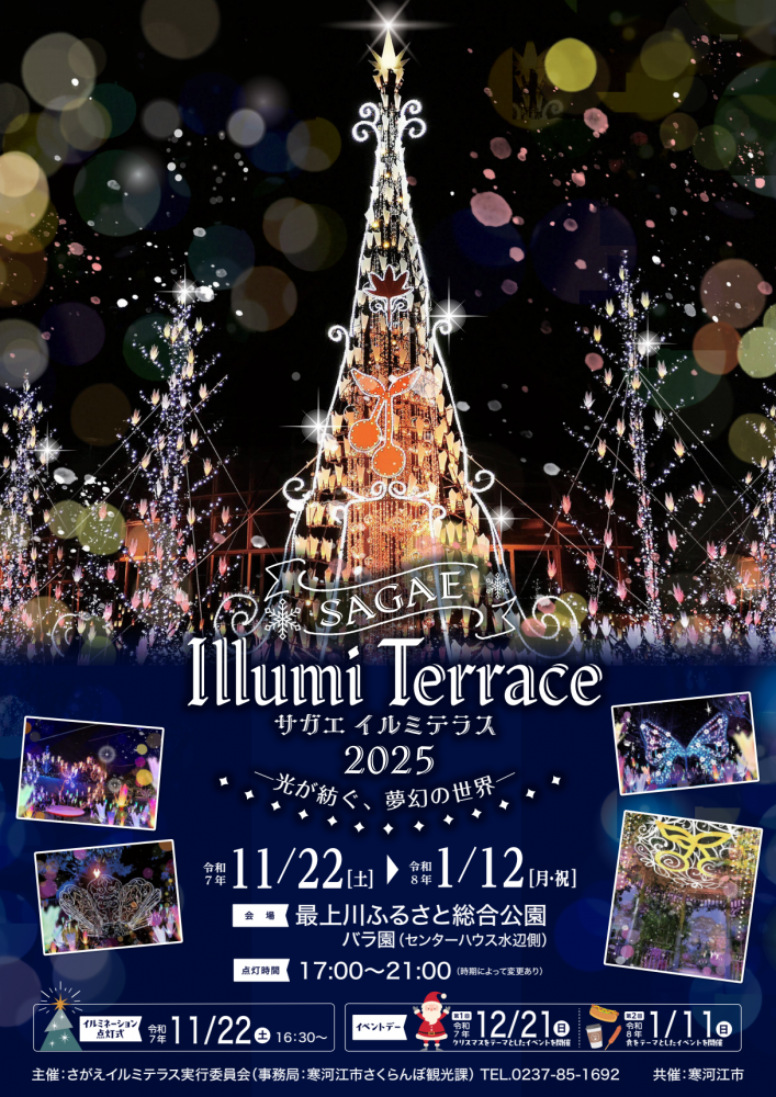 2025年冬、寒河江市で新たに「さがえイルミテラス」が始まります。このイベントは、冬期間の観光を盛り上げ、街に賑わいを創出することを目的としています。最上川ふるさと総合公園を舞台に、音楽とシンクロして変化するイルミネーションが、訪れる人々を幻想的な世界へと誘います。冬花火やグルメイベントも満載で、家族、カップル、友人と、誰もが楽しめる光の祭典です。