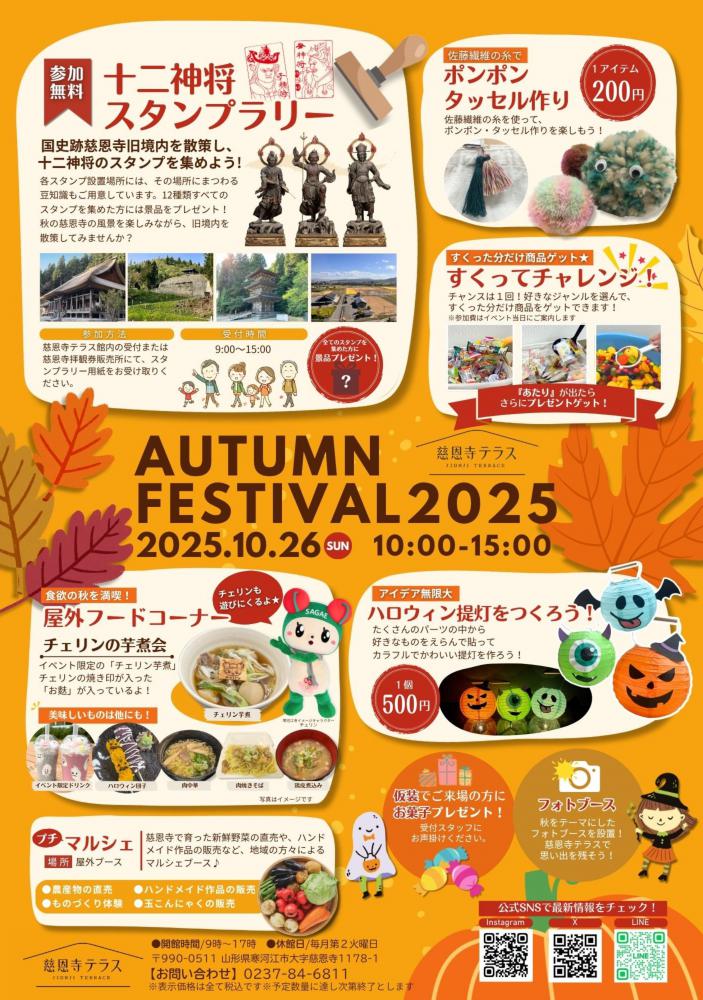 2025年10月26日(日)、寒河江市の「慈恩寺テラス」にて、秋の魅力を満喫できる「AUTUMN FESTIVAL 2025」が開催されます。 国史跡・慈恩寺の境内を巡る無料のスタンプラリーや、山形の秋の味覚「芋煮」、ハロウィンにちなんだワークショップなど、子どもから大人まで一日中楽しめるイベントが盛りだくさんです。 ご家族やご友人と一緒に、慈恩寺の美しい秋の一日を過ごしませんか?