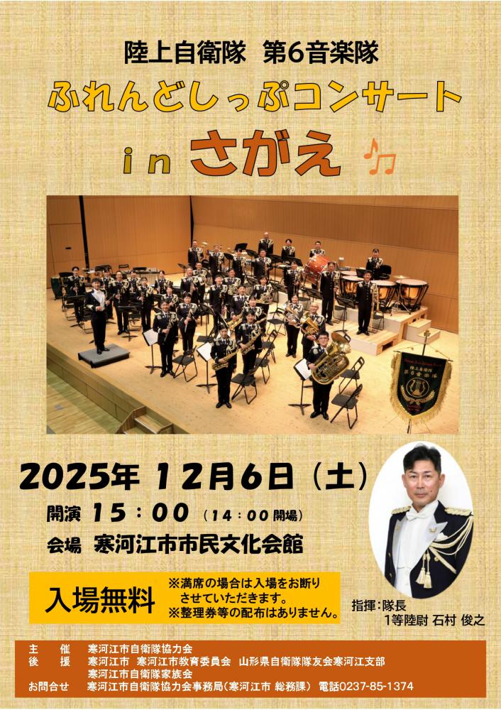 寒河江市市民文化会館にて、陸上自衛隊 第6音楽隊による「ふれんどしっぷコンサート in さがえ」が開催されます。