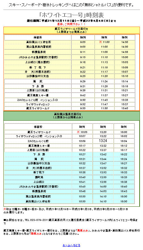 「蔵王猿倉スキー場」「蔵王ライザワールド」へは無料シャトルバスの