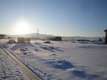 車庫から東を見たら、ちょうど朝陽が正面に。