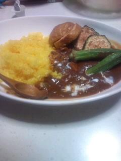 サフランのご飯に素揚げしたジャガイモ、オクラ、ズッキーニをトッピング。夏カレー作りました。うまかった。