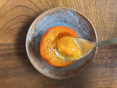 匙で救えるほど熟しているかきはトロリとしています。種があるかなーと思ったらなかった。っていみです。