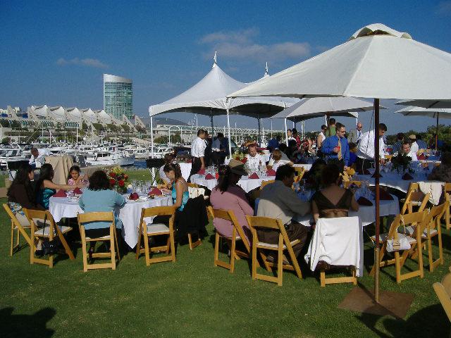 30分ぐらいのセレモニーが終わると、下の写真がこんな感じになります。着く席は適当。食事は立食。食べ放題、飲み放題。ピーカンの空の下、みな楽しそうでした。