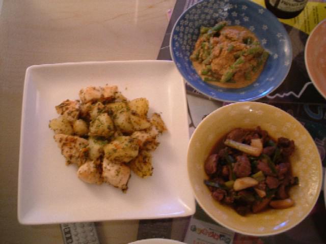 まず、引越し先で新○生活をスタートさせるため、必要なものを買うことから始まった。何せ、SD来て5年たつが、常にルームメイトと住んでいたので、食器類をはじめ、「食べる」ためのものが一つもないことに気づく。二人で(たまにロイも)一緒にいろいろ買い揃えた。で、早速それを使って調理。二人とも「のんべい」で、毎晩「おつまみ」系中心の夕食。写真はその一つ。ポテトとチキンのイタリアン香草炒め。インゲン胡麻和え。すなぎもの赤ワイン煮。パートナー。意外に料理上手いです。