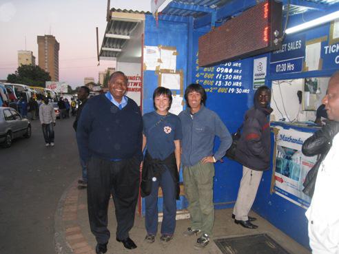 写真は長距離バスターミナルで出発前にバス会社の社長と談笑