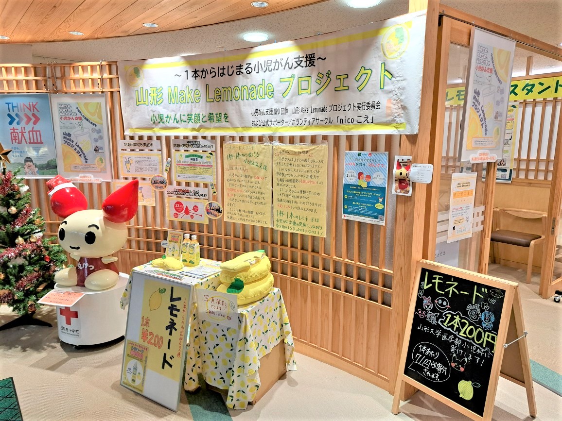 このため、山形県赤十字血液センター山形駅前出張所の献血ルームSAKURAMBOさんの全面協力のもと、**2025年12月16日(火)~12月28日(日)**の期間、献血ルーム内で小児がん支援を目的とした「レモネードスタンド」を実施していただきました。最終日の12月28日には「nicoこえ」と「nicoぷらAd」のメンバーもルームにお邪魔し、ご来場の方々に小児がん支援の活動紹介を行い、献血と支援のつながりを知ってもらう良い機会となりました。