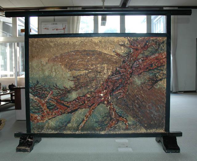 玄関正面には日本画の衝立がおいてあります。戦前から戦後にかけて、山形県に多くの作品を残した「朝一圭鳳」画伯の松の絵です。当館の名称に合わせて描いた松の絵です。