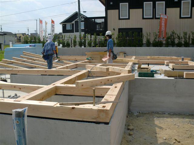 土台敷きが始まりました、暑い中ご苦労様です。