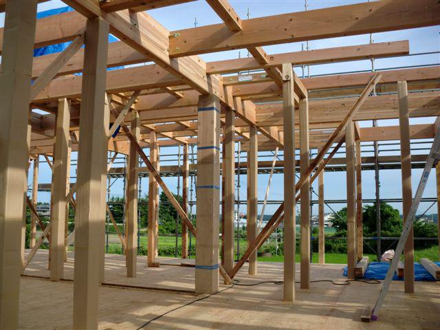 建て方が始まりました、奥に見えるのは、24p角の檜大黒はしらです、立派な柱だ。